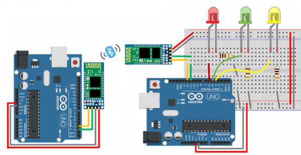 ▷ 한쪽의 아두이노에 LED 3개와 블루투스를 연결하여