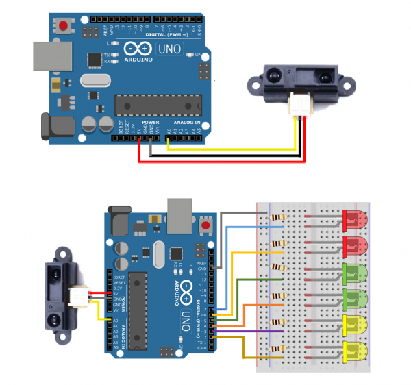 적외선(IR) 송수신 센서 모듈 : 거리 측정하기 작성자 임베디드코리아 작성일25-05-16 00:37 조회803회 댓글0건 첨부파일 IR_Distance.ino (263byte) 10회 다운로드 DATE : 2025-05-20 00:09:39 이전글 다음글 목록 ■ 적외선 센서 : 2Y0A21 모듈 ▶ 적외선을 이용해서 센서와 물체 사이의 거리를 측정한다. ▶ 측정 범위는 10~80Cm 이며, 동작 wjs압은 4.5V~5V 이다. --------- < 적외선 송수신 센서 거리 측정 소스 코드 > ----------------------------------------- int distance = 0; void setup() { Serial.begin(9600); } void loop() { int volt = map(analogRead(A0), 0, 1023, 0, 5000); distance = (27.61 / (volt - 0.1696)) * 1000; Serial.print(distance); Serial.print(" cm"); Serial.println(" "); delay(1000); } 이전글 다음글 목록